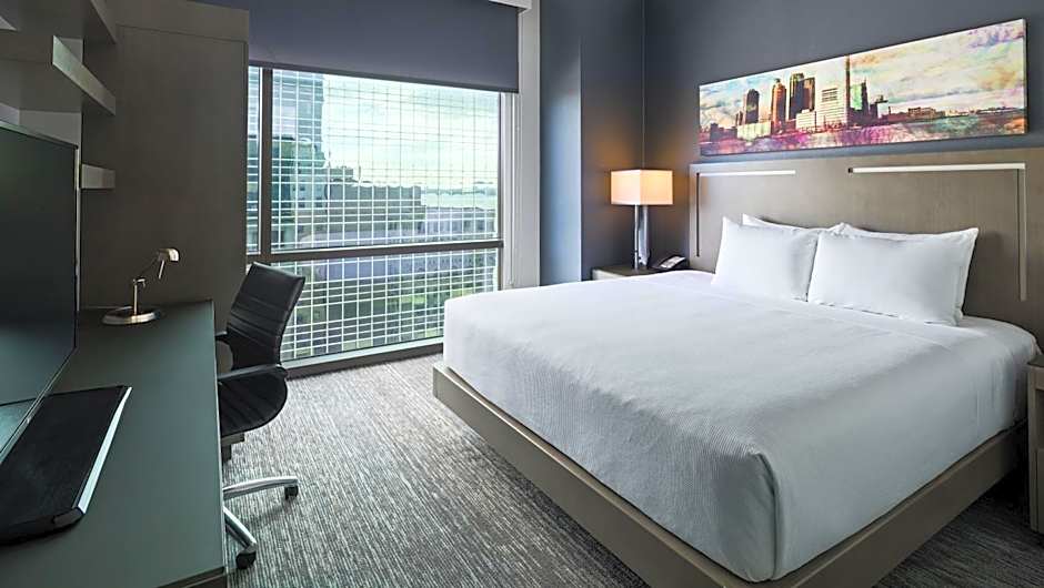 The King guestroom features contemporary décor with one King plush bed. Other features include a closet, a 42" flat panel TV, a workspace and a bathroom with a glass walk-in shower.